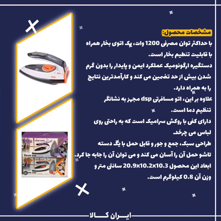 مشخصات محصول: با حداکثر توان مصرفی ، یک اتوی بخار همراه با قابلیت تنطیم بخار است و به شما کمک می کند تا در حین انجام کار، به راحتی چروک های روی لباس های خود را از بین ببرید. فوران قدرتمند بخار، لباس های شما را صاف و شفاف نگه می دارد و ظاهری تازه و جدید به آن ها می بخشد. دستگیره ارگونومیک عملکرد ایمن و پایدار را بدون گرم شدن بیش از حد تضمین می کند و کارآمدترین نتایج را به همراه دارد. این اتو مجهز به محافظ در برابر گرمای بیش از حد است که به شما کمک می کند تا از انواع پارچه ها بدون سوختن اتو کنید و زندگی شما را آسان تر کند. علاوه بر این، اتو مسافرتی dsp مجهز به نشانگر تنظیم دما است . دارای کفی با روکش سرامیک است که به راحتی روی لباس می چرخد و بهترین نتیجه را ایجاد می کند. طراحی سبک، جمع و جور و قابل حمل با یک دسته تاشو حمل آن را آسان می کند و می توان آن را جابه جا کرد. ابعاد این محصول 20.9x10.2x10.3 سانتی متر و وزن آن 0.8 کیلوگرم است. محصول اورجینال و خاص
