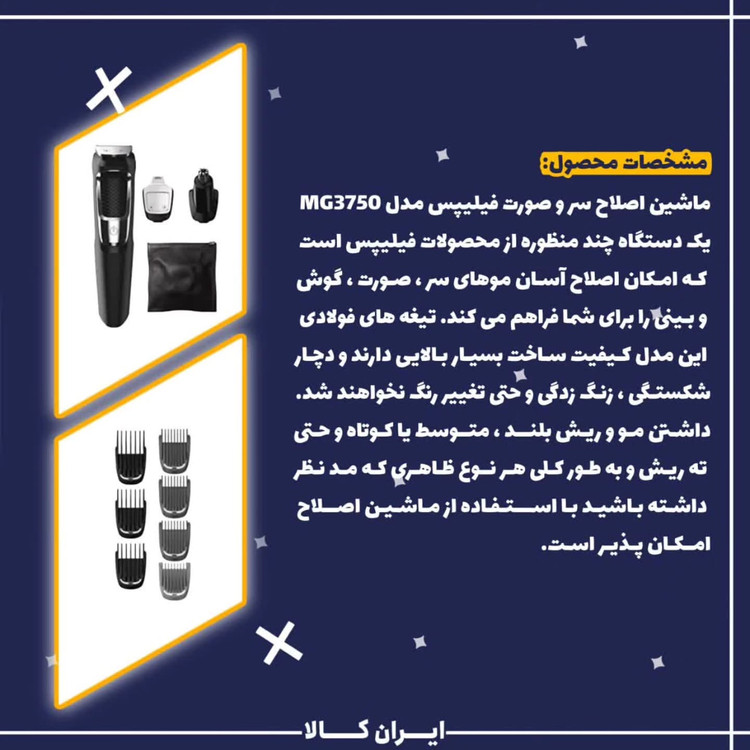 ماشین اصلاح صورت فیلیپس مدل MG3750 سری 3000 ماشین اصلاح سر و صورت فیلیپس مدل MGک دستگاه چند منظوره از محصولات فیلیپس است که امکان اصلاح آسان موهای سر ، صورت ، گوش و بینی را برای شما فراهم می کند. تیغه های فولادی این مدل کیفیت ساخت بسیار بالایی دارند و دچار شکستگی ، زنگ زدگی و حتی تغییر رنگ نخواهند شد.داشتن مو و ریش بلند ، متوسط یا کوتاه و حتی ته ریش و به طور کلی هر نوع ظاهری که مد نظر داشته باشید با استفاده از ماشین اصلاح امکان پذیر است.